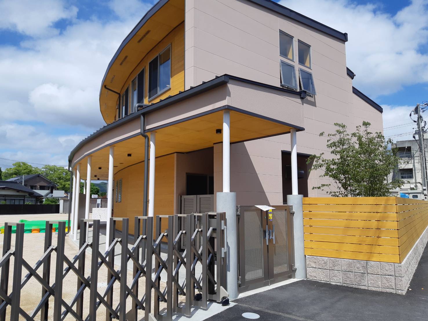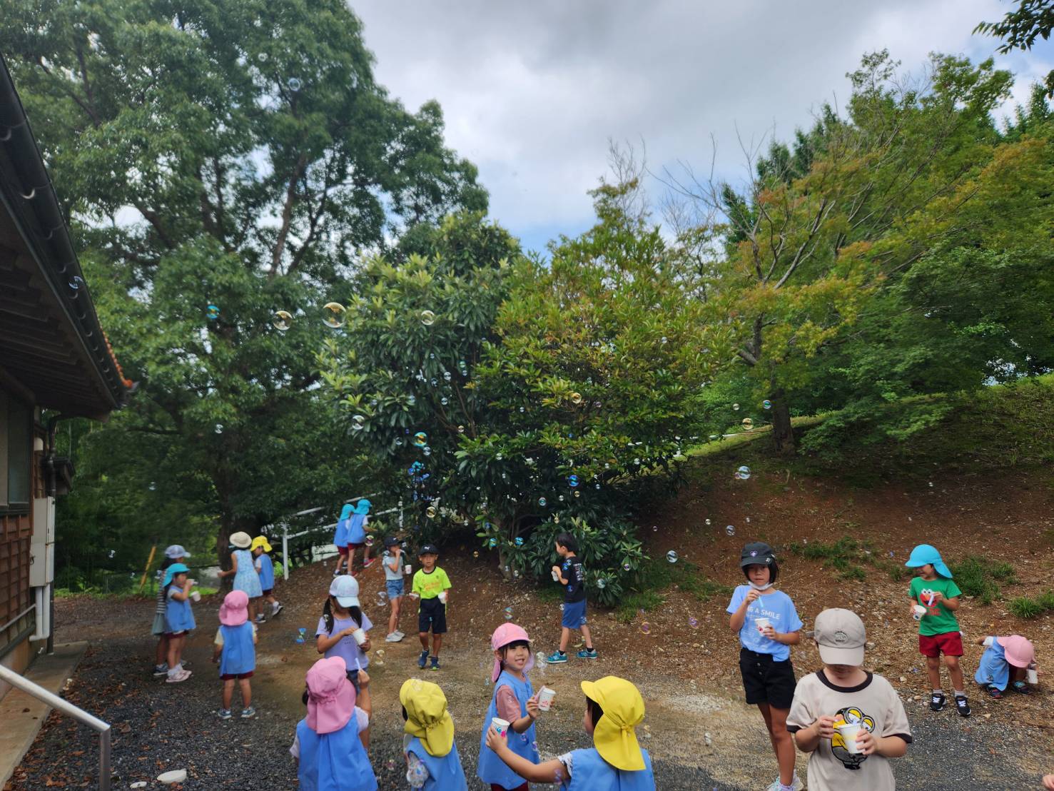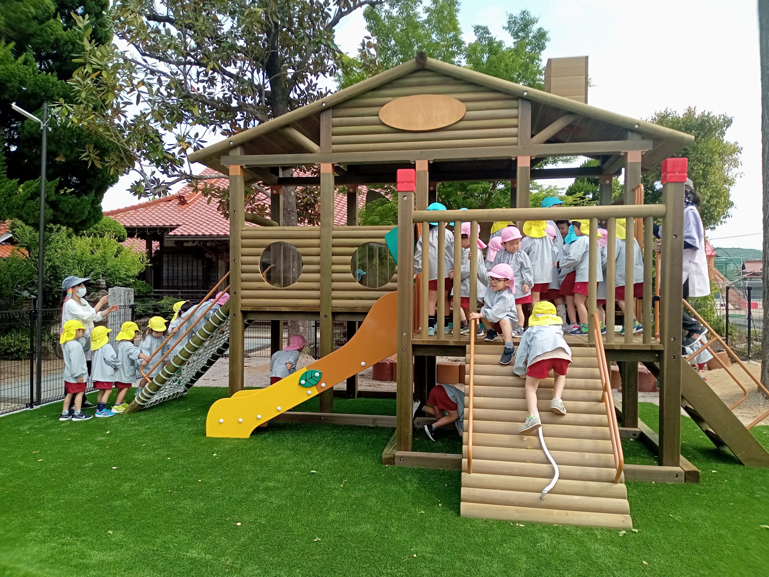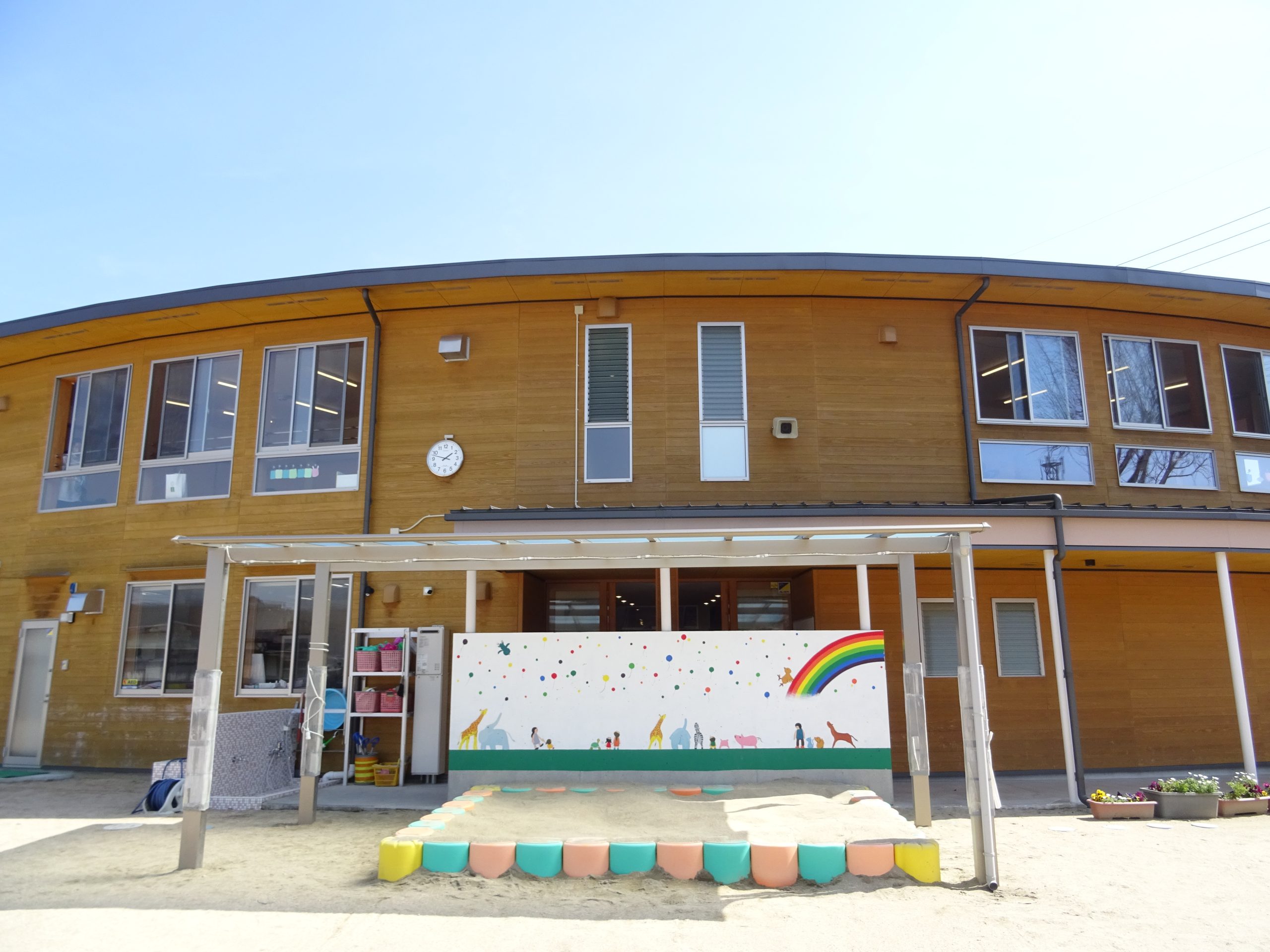 ぬくもりを感じる木造建築の園舎。園庭には自然豊かな「冒険の森」があり、四季折々の木々と触れ合えます。