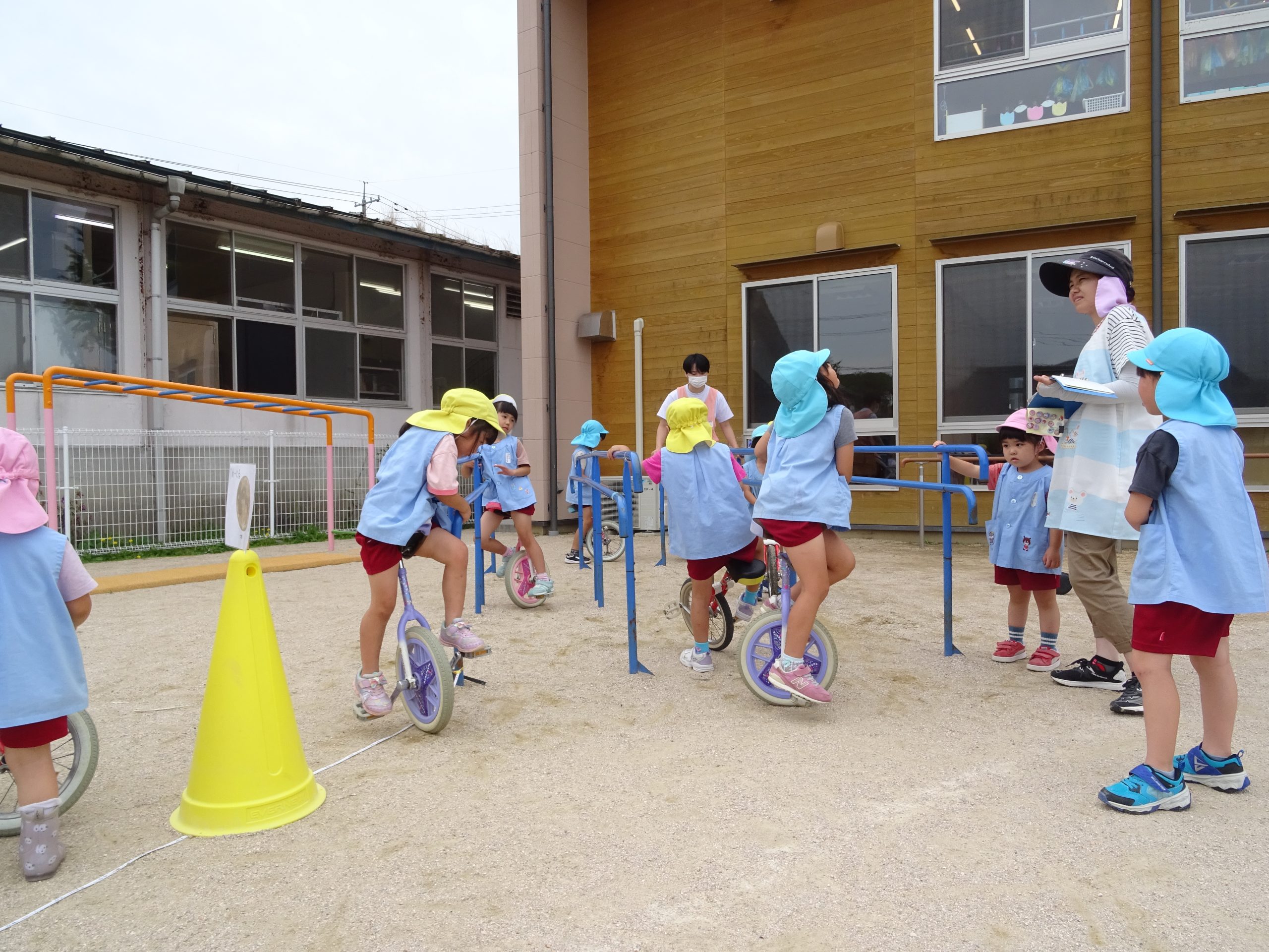 年長組だけでなく、年中組も頑張っています。年少組は、先生に乗せてもらって一輪車に触れる楽しさを味わっています。