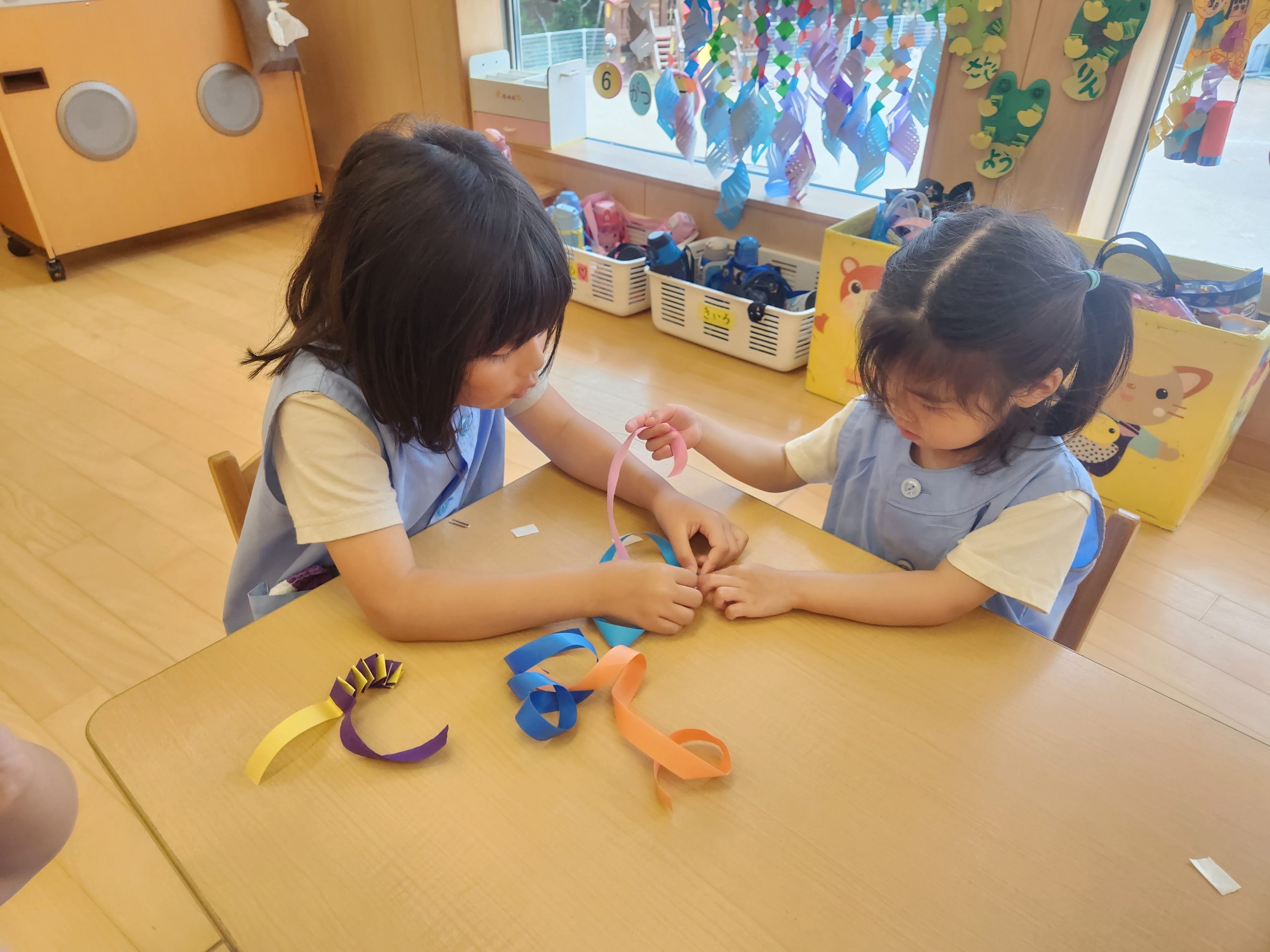 3歳児~5歳児の子どもたちは、お花の名前がついた3つのグループに分かれて過ごす中で、3~4人のグループを家族に見立て、一緒に歌を歌ったり、製作をしたり異年齢で活動をしています。